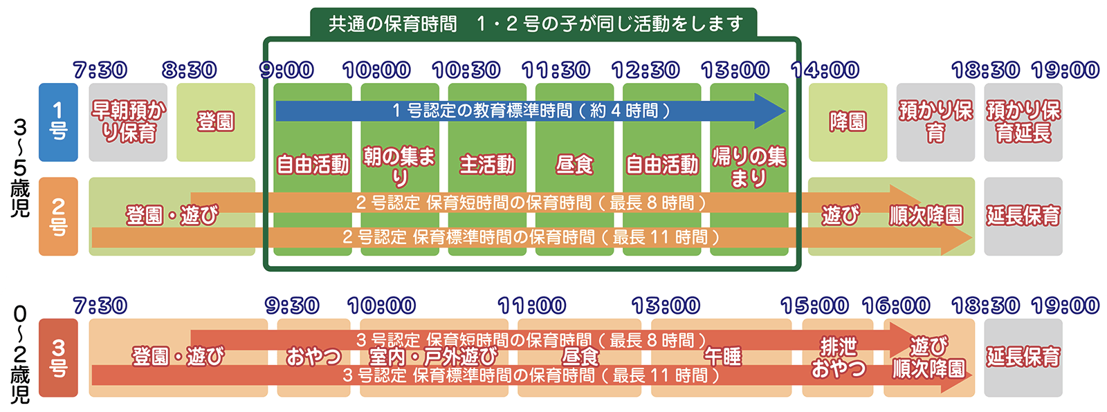 | 2号認定 | 3〜5歳 | 8時間または11時間 | 保育所のような利用。共働きなど就労等の家庭の事情に応じて標準時間(11時間)または短時間(8時間)の利用となります。 |