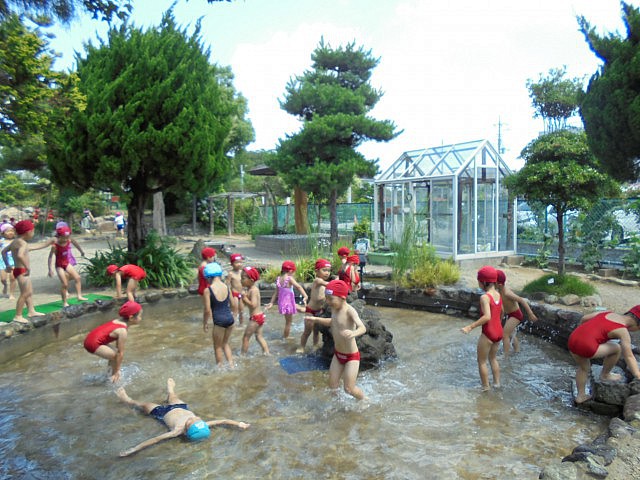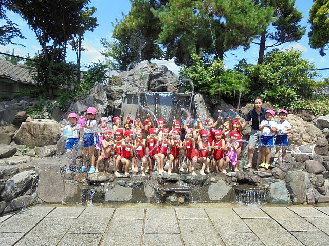 水着に着替え、園庭や自然環境園で伸び伸びあそんだ子ども達太陽の光に輝く水しぶきに負けないくらい、みんなの笑顔も輝いていましたよ