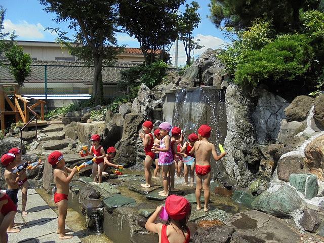 先週から始める予定だった【水遊び】。雨だったり若干肌寒かったりして延期につぐ延期となってしまいましたが、、、、やっと今日天候、気温にも恵まれ、園庭と自然園での水遊びを開始しました