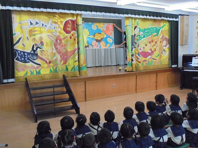 今日の出し物は大型紙芝居『11ぴきのねことあほうどり』でした