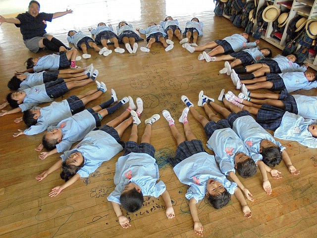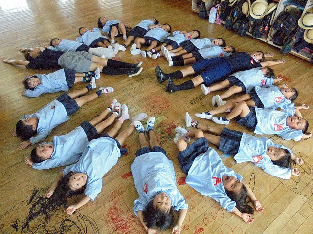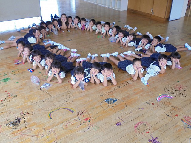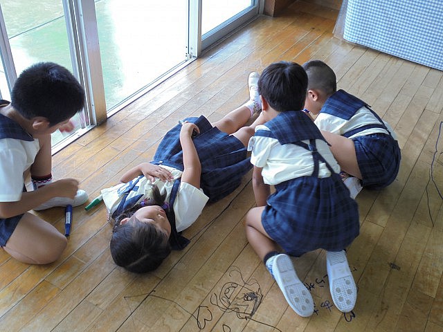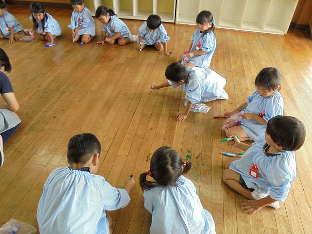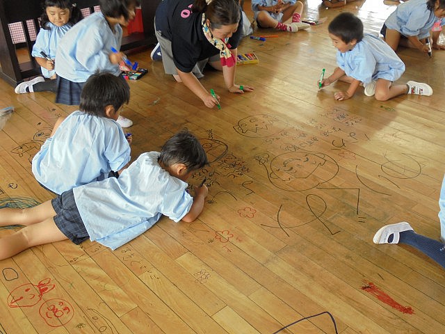 以前からお知らせしているように、今年度の夏休み中は2階の床工事を行います。それに伴い、今日まで約38年もの間、子ども達の笑顔や頑張り、時には汗や涙も・・・様々な場面を見守ってくれた『床』に感謝の気持ちを込めて、みんなでマジックでお絵描きをしました  ボディペインティングの時もそうでしたが、普段のお絵描きのお約束から逸脱する活動なので、やはり最初はみんな恐る恐る・・・の子ども達